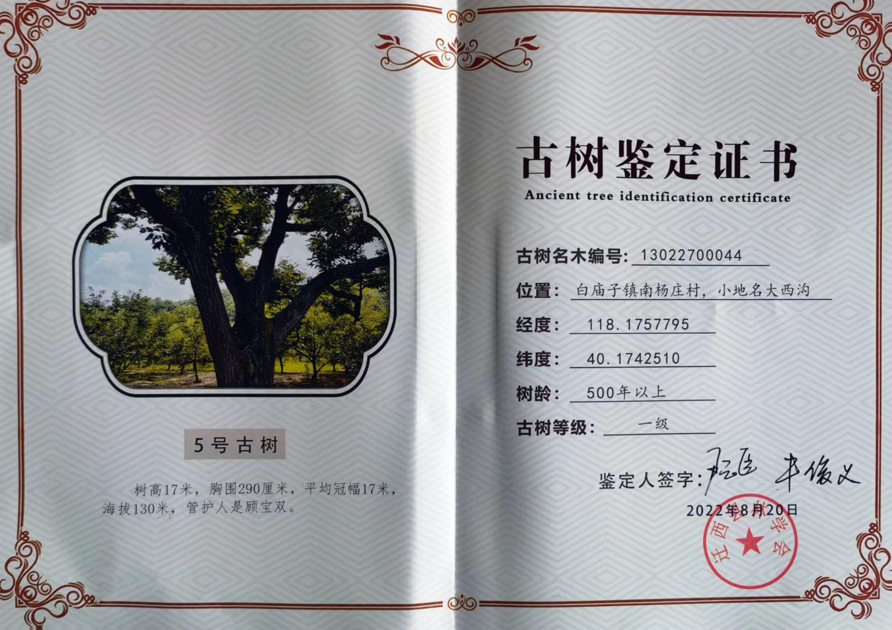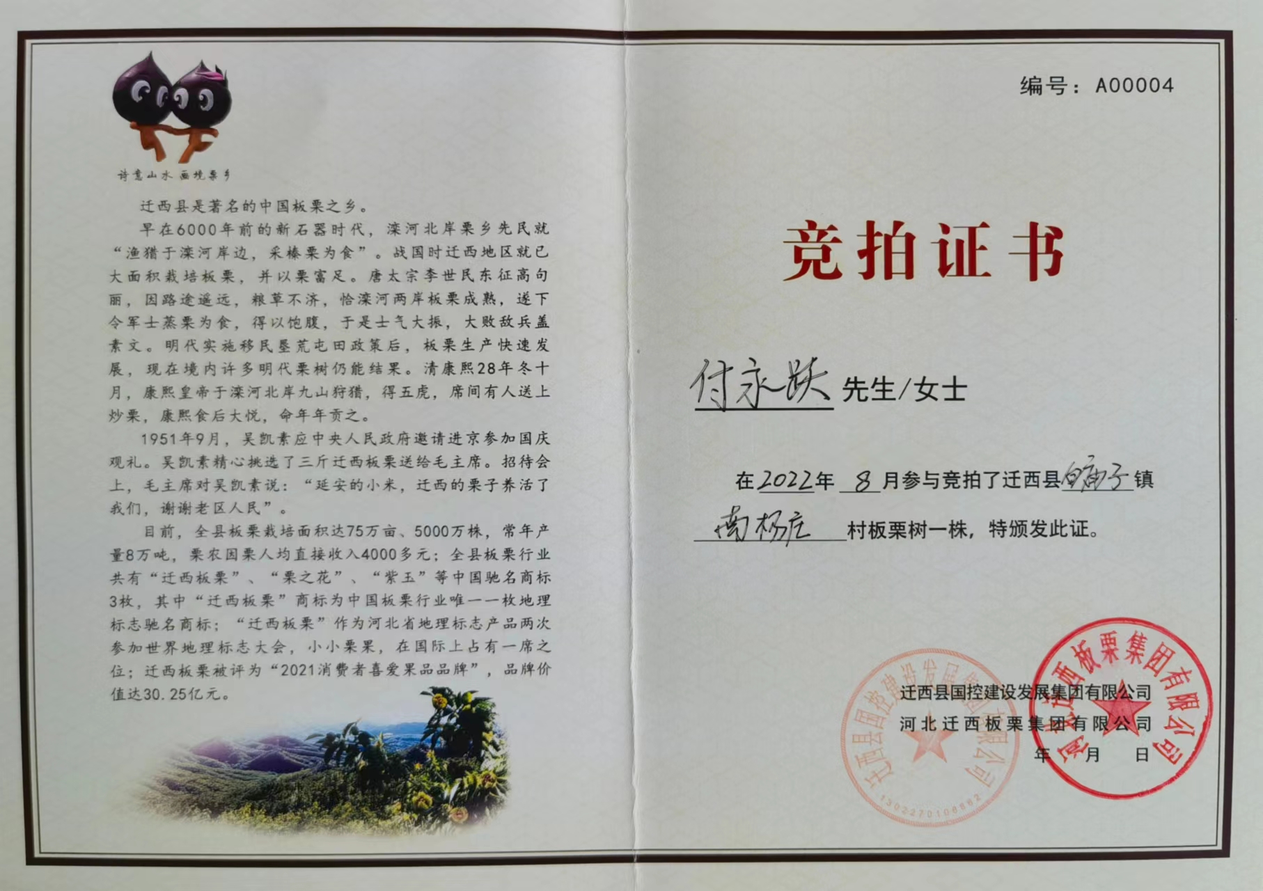河北亨旺投資集團(tuán)榮獲500年以上板栗古樹認(rèn)養(yǎng)權(quán)