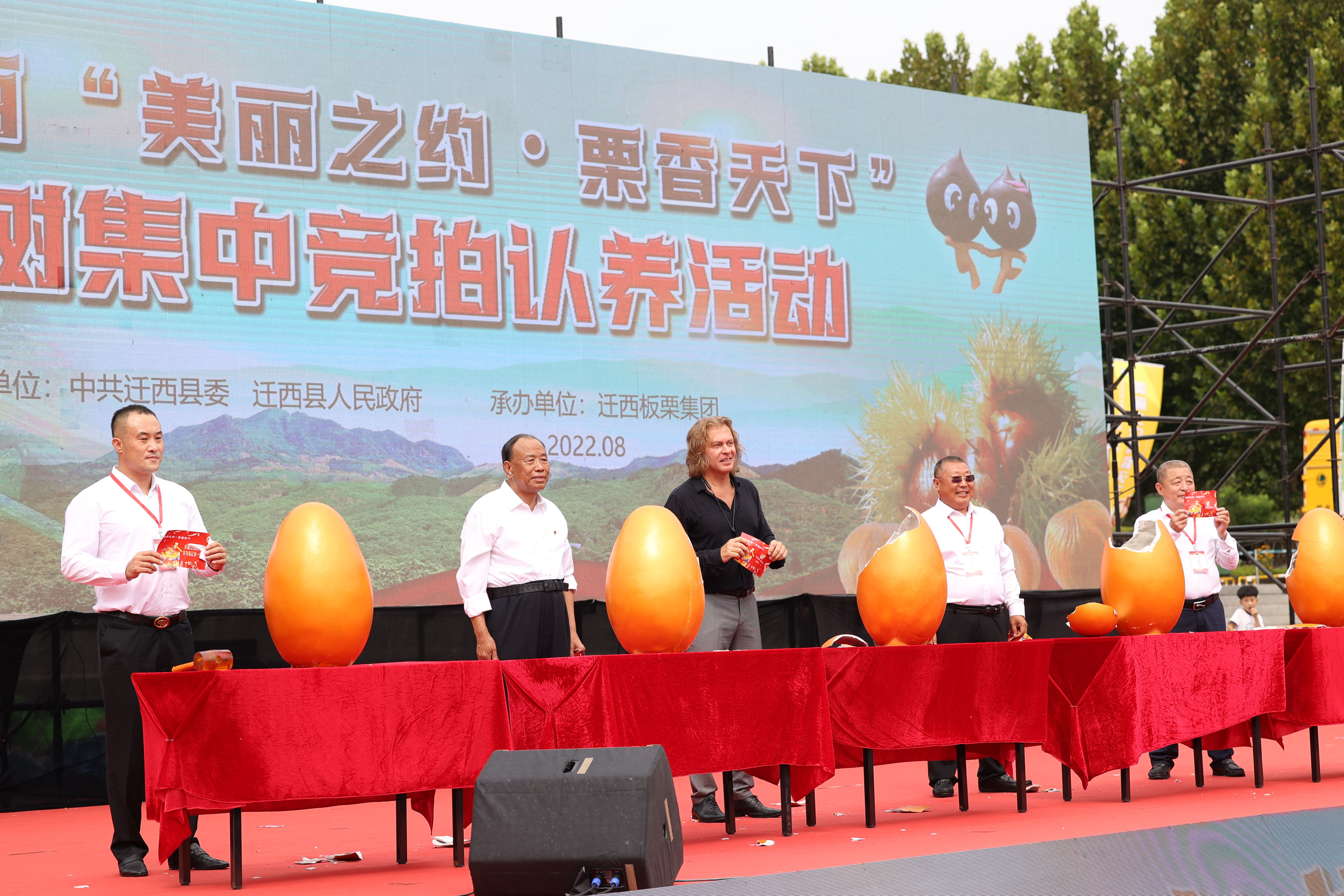 2022年8月21日上午,我縣在中國(guó)板栗博物館廣場(chǎng)開展首屆中國(guó)遷西“美栗之約?香滿天下”板栗樹集中競(jìng)拍認(rèn)養(yǎng)活動(dòng)。中國(guó)工程院院士尹偉倫,北京農(nóng)學(xué)院植物科學(xué)技術(shù)學(xué)院院長(zhǎng)秦嶺,農(nóng)業(yè)農(nóng)村部中國(guó)綠色食品發(fā)展中心主任張華榮,河北省林草局副局長(zhǎng)王宇等各級(jí)領(lǐng)導(dǎo)和來自日本、意大利、俄羅斯、烏克蘭等國(guó)家的外國(guó)友人、媒體記者出席活動(dòng)。中國(guó)食品土畜進(jìn)出口商會(huì)板栗分會(huì)秘書長(zhǎng)孫宇,唐山市政協(xié)副主席董學(xué)忠,遷西縣委書記蔡宗健分別在認(rèn)養(yǎng)活動(dòng)上致辭。遷西縣四大班子領(lǐng)導(dǎo)出席活動(dòng)。
